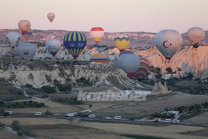 Göreme beldesi ve çevresindeki çeşitli alanlardan gün doğumunda gökyüzüne yükselen sıcak hava balonları, yaklaşık 45 dakika boyunca peribacalarıyla kaplı vadiler üzerinde süzülüyor.