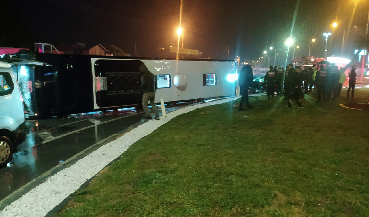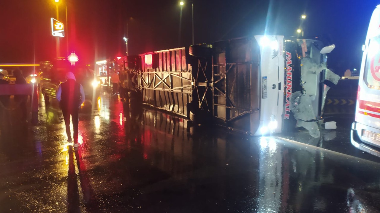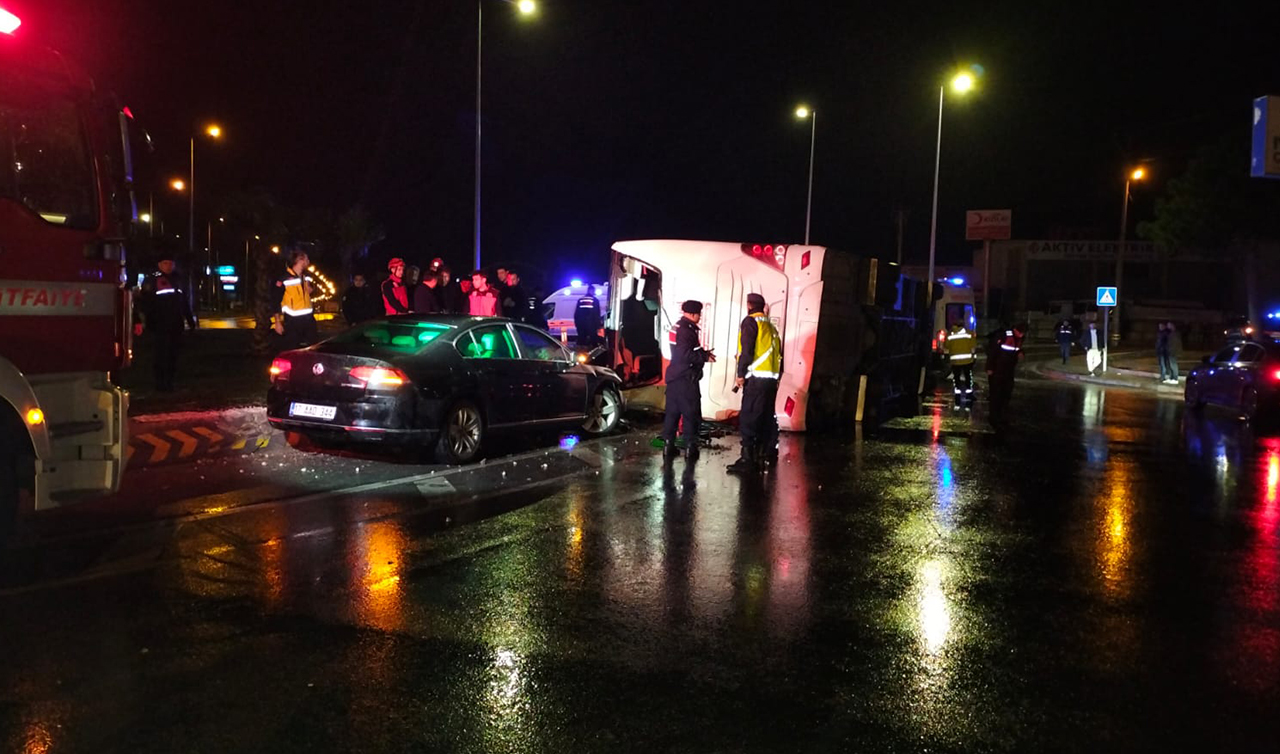 Ö.K. yönetimindeki yolcu otobüsü, Çanakkale-İzmir kara yolu Kızılay Sanayi Döner Kavşağı'nda aydınlatma direğine çarparak devrildi.