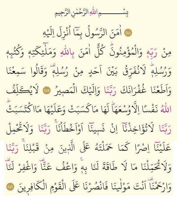 Amene-rrasulu bima unzile ilayhi min rabbihi velmu / minûn. Kullunámene bi (A)llâhi ve melâ-iketihi ve kutbihi ve rusulihi la nuferriku beyne ehadin rusulih ve kalu semi’na ve ata’na gufraneke rabbenâ ve-ileyke-lmasîr (u)