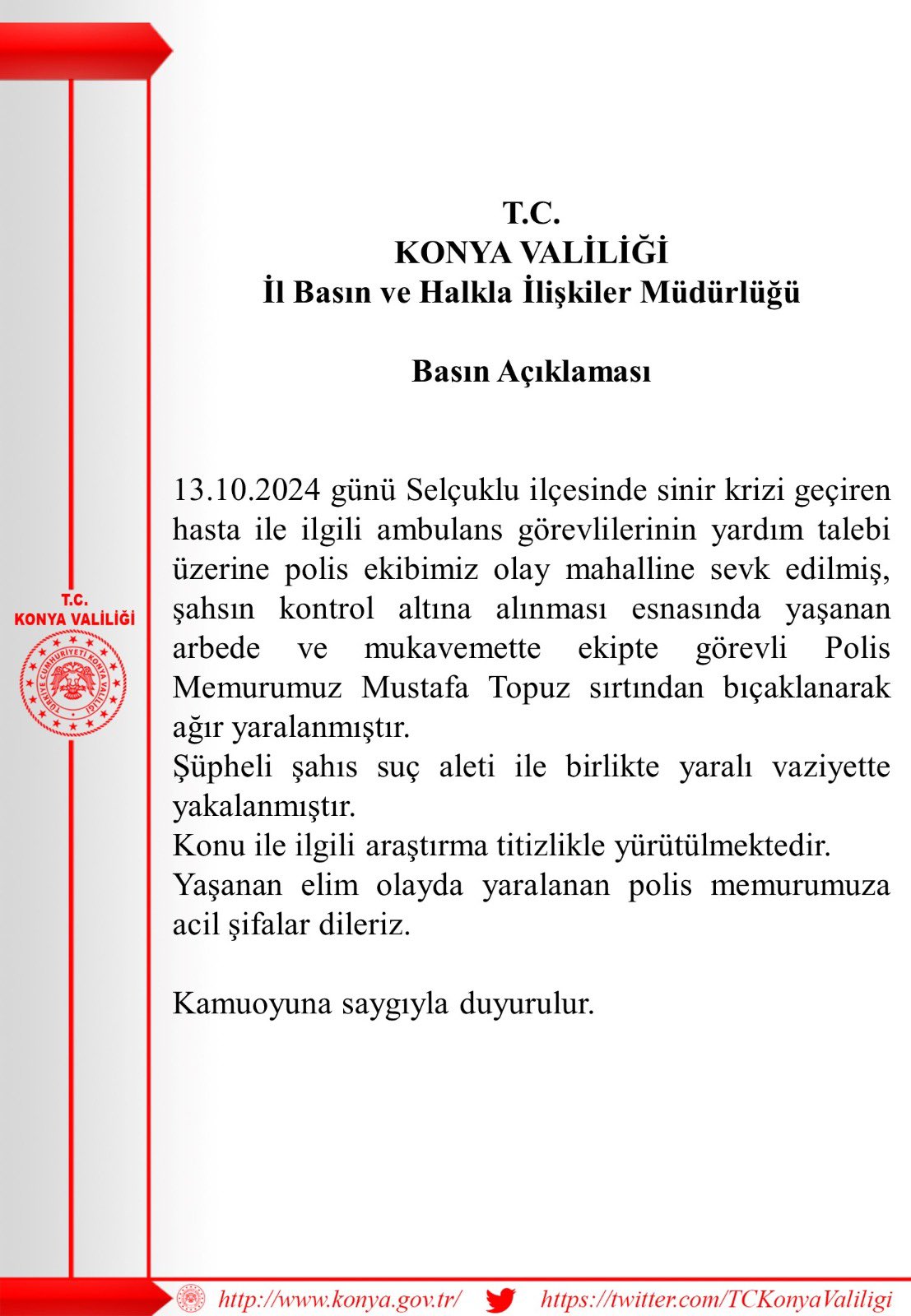 Valilikten yapılan açıklamada ise şunlar kaydedildi: "Selçuklu ilçesinde sinir krizi geçiren hasta ile ilgili ambulans görevlilerinin yardım talebi üzerine polis ekibimiz olay mahalline sevk edilmiş, şahsın kontrol altına alınması esnasında yaşanan arbede ve mukavemette ekipte görevli polis memurumuz Mustafa Topuz sırtından bıçaklanarak ağır yaralanmıştır. Şüpheli şahıs suç aleti ile yaralı vaziyette yakalanmıştır. Konu ile ilgili araştırma titizlikle yürütülmektedir. Yaşanan elim olayda yaralanan polis memurumuza acil şifalar dileriz."