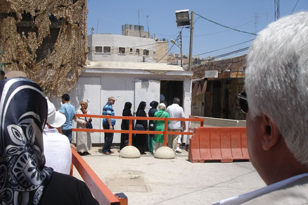 Halil kentinin tarihi kent sınırında durduruluyoruz. Buradan sonrasını yürüyerek gitmemiz gerekiyor. Bu çizginin ötesine Müslümanların araçla girmesi yasak. Herkes evine veya gideceği yere yürüyerek gidiyor. Yahudilerin ise araçla dolaşmaları serbest. Birinci kontrol noktasından cihazdan geçirilerek aranıyoruz ve yolumuza devam ediyoruz 100 metre sonra ikinci kontrol noktasına geliyoruz. Buradan da aranıp kontroller yapıldıktan sonra yola devam ediyoruz.