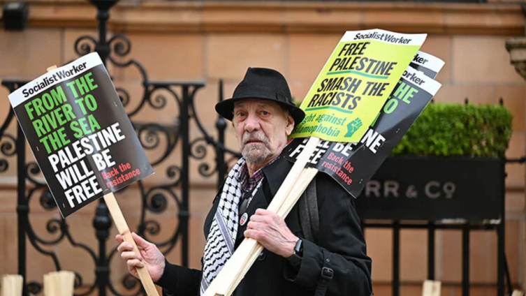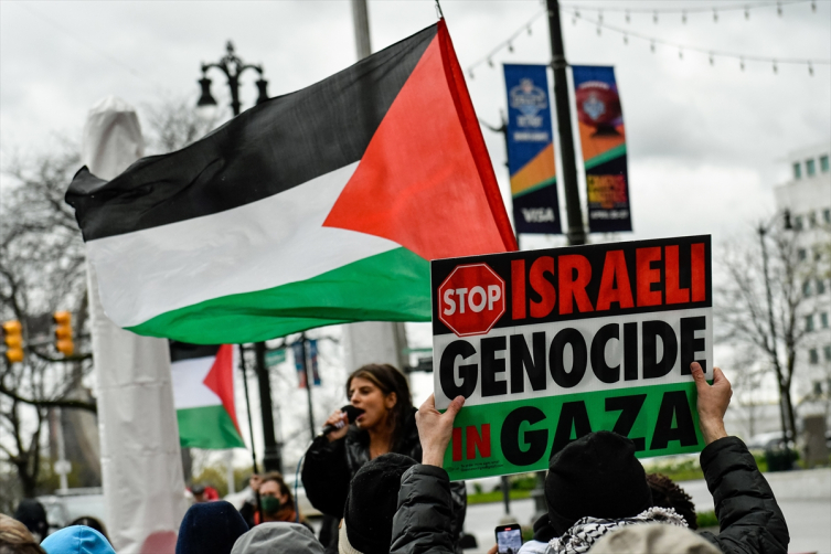Protestocular, Filistin bayraklarının yanı sıra "Soykırımı durdurun", "Siyonizm terördür" ve "ABD, Avrupa, İsrail'in soykırım ortağıdır" yazılı dövizler taşıdı.