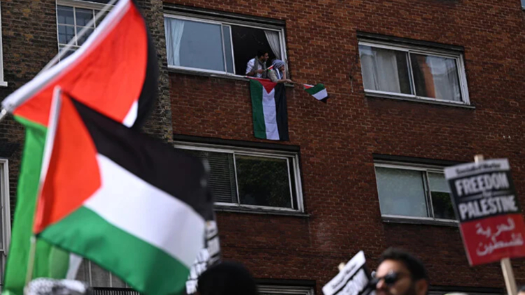 Filistin destekçilerinin yürüyüşü sırasında bir grup İsrail yanlısı da Bush House isimli tarihi bina yakınlarında ellerinde bayraklar ve pankartlarla karşı gösteri düzenledi.