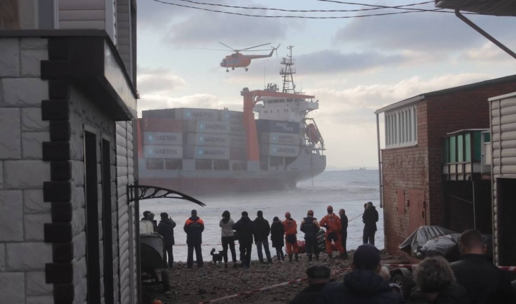 Rusya'nın, Japon Denizi kıyılarında karaya oturan ve makine dairesi su alan konteyner gemisindeki 14 denizci helikopterlerle kurtarıldı.