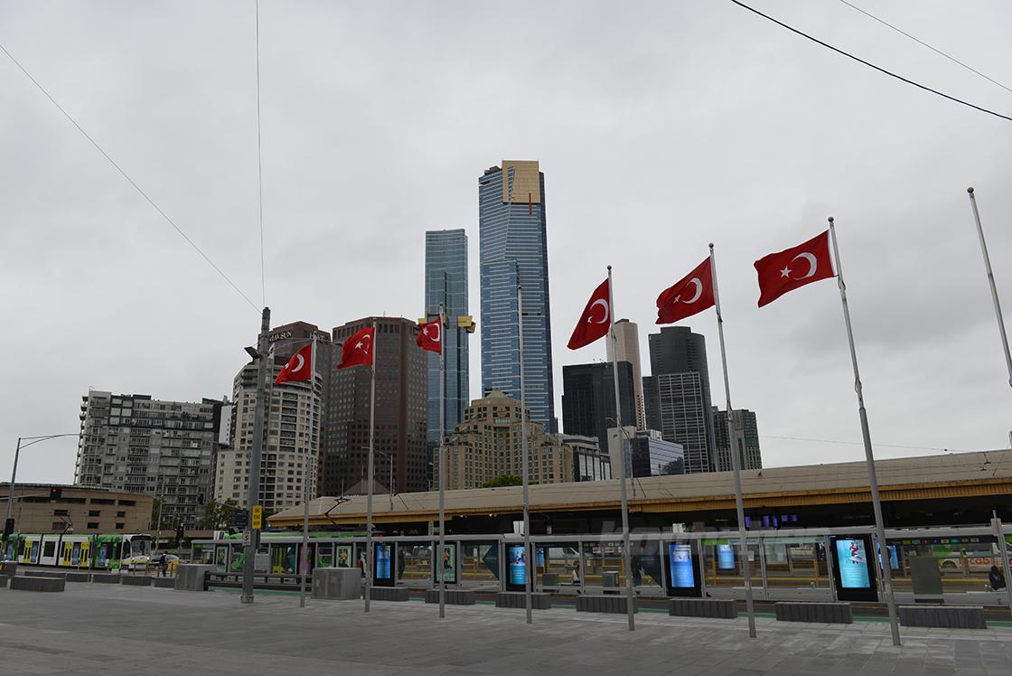 Melbourne Federasyon Meydanı'ndaki göndere, Türkiye Cumhuriyeti'nin kuruluşunun 98. yıl dönümü dolayısıyla her yıl olduğu gibi bu senede İstiklal Marşı eşliğinde Türk bayrakları çekildi.