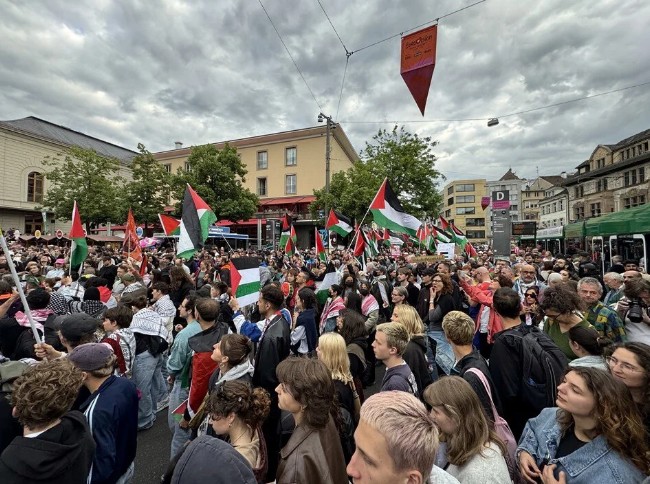 Bugün finalden önce Basel'in merkezinde düzenlenmesi istenen gösteriye polis izin vermedi, polis protestoculara karşı biber gazı kullandı. Gösterilerde Avrupa Yayın Birliği (EBU) protesto edildi. Soykırım devam ederken İsrail'in bu yarışmaya katılması kınandı.