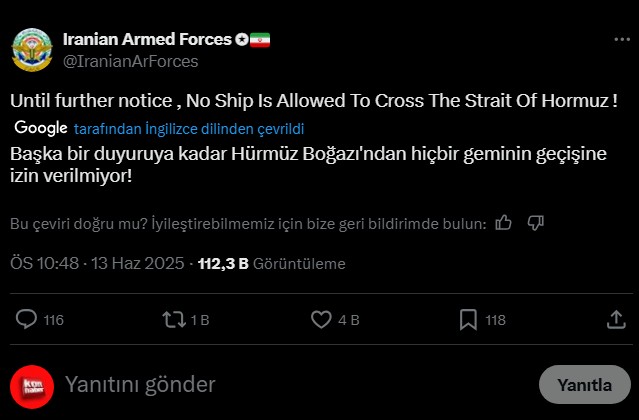 İran İslam Cumhuriyeti Ordusu'nun sosyal medya hesabından yaptığı açıklamada Hürmüz Boğazı'nı gemi geçişine kapattığını duyurdu.