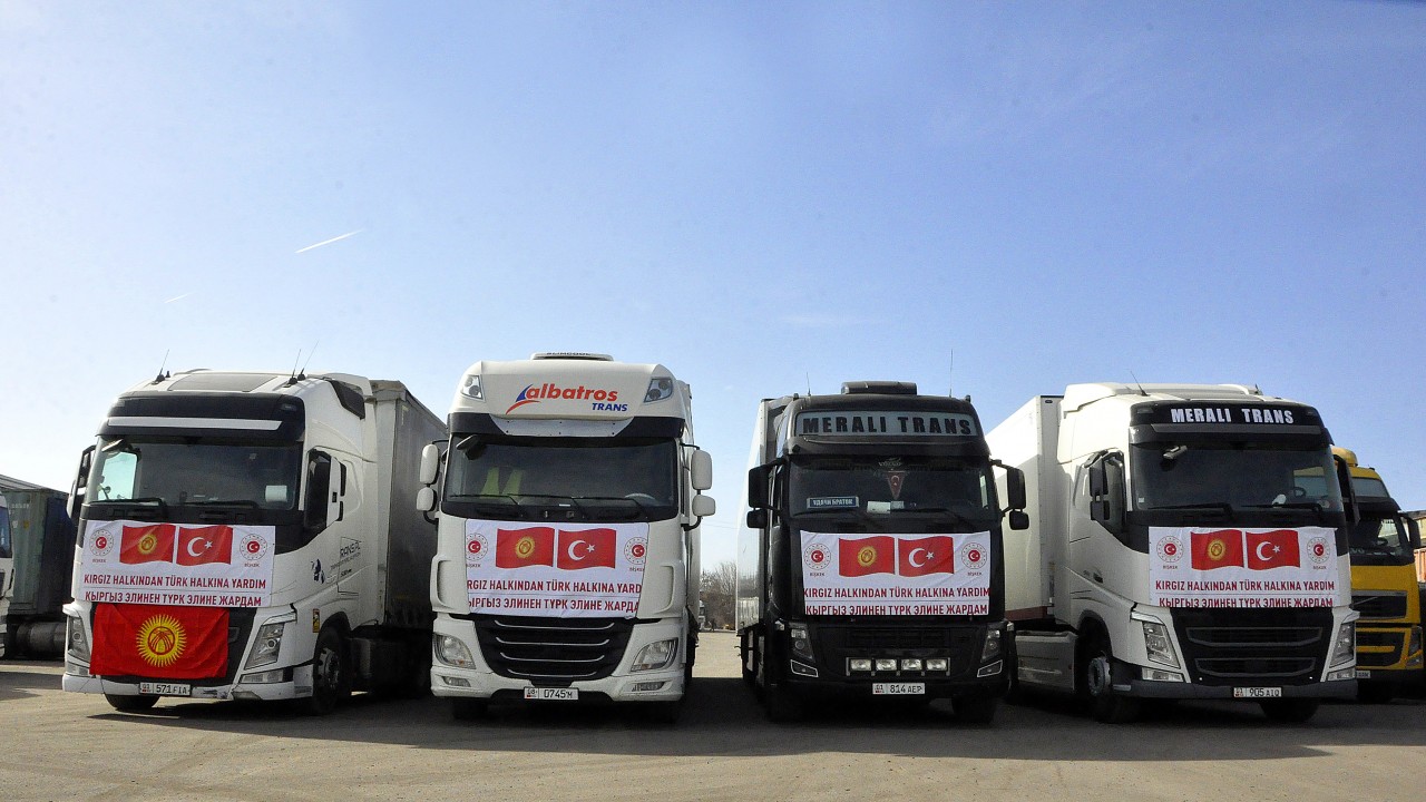 Kahramanmaraş merkezli depremlerden etkilenenler için Kırgızistan'da düzenlenen yardım kampanyasında toplanan ihtiyaç malzemelerinin yüklendiği 4 tır, Türkiye'ye uğurlandı.