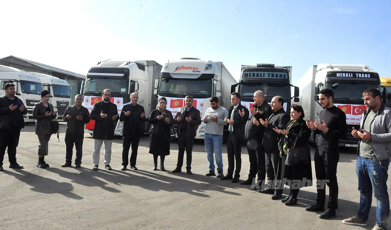 Programda, Türkiye'nin Bişkek Büyükelçiliğinde toplanan yardım malzemelerinin deprem bölgesine kara yoluyla ulaştırılması için Bişkek'te faaliyet gösteren Türk lojistik şirketi sahiplerinin destek olduğu ifade edildi."Kırgız halkından Türk halkına yardım" yazılı 4 tır, dualarla afet bölgesine uğurlandı.