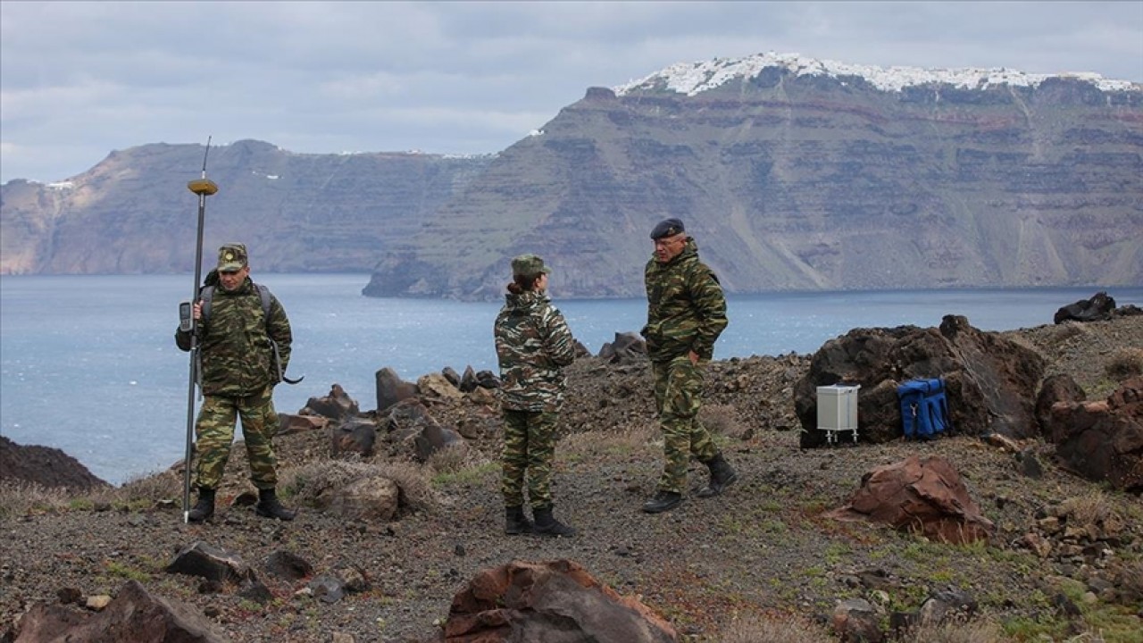 Uzmanlar ve ordu mensupları, Santorini Kalderası'ndaki Yeni Kameni volkanik adacığında, son haftalarda artan sismik hareketlilik nedeniyle incelemelerde bulundu.