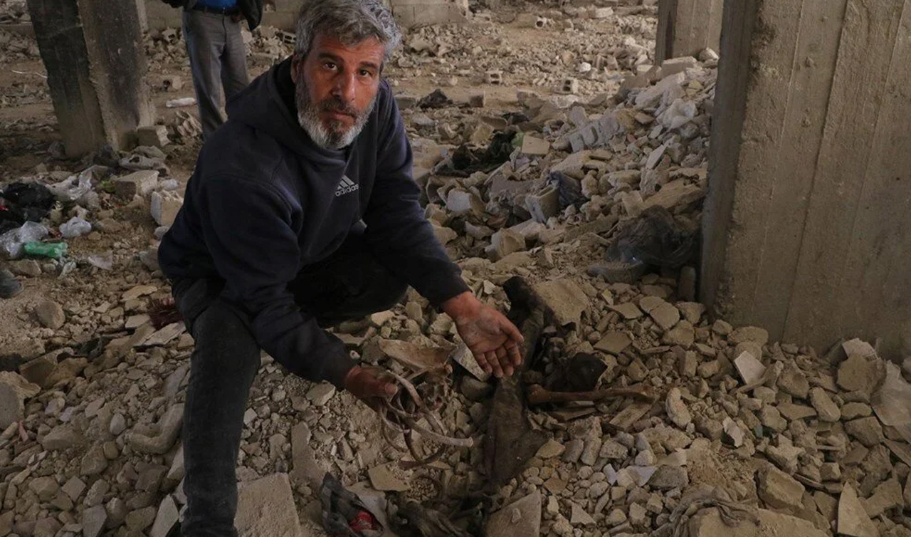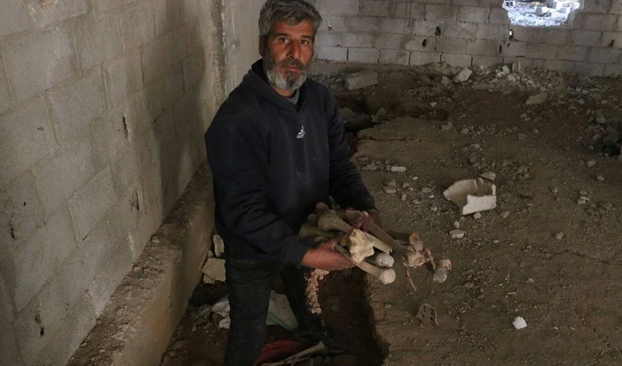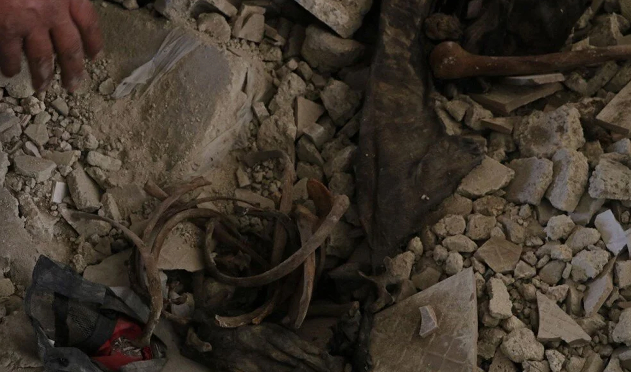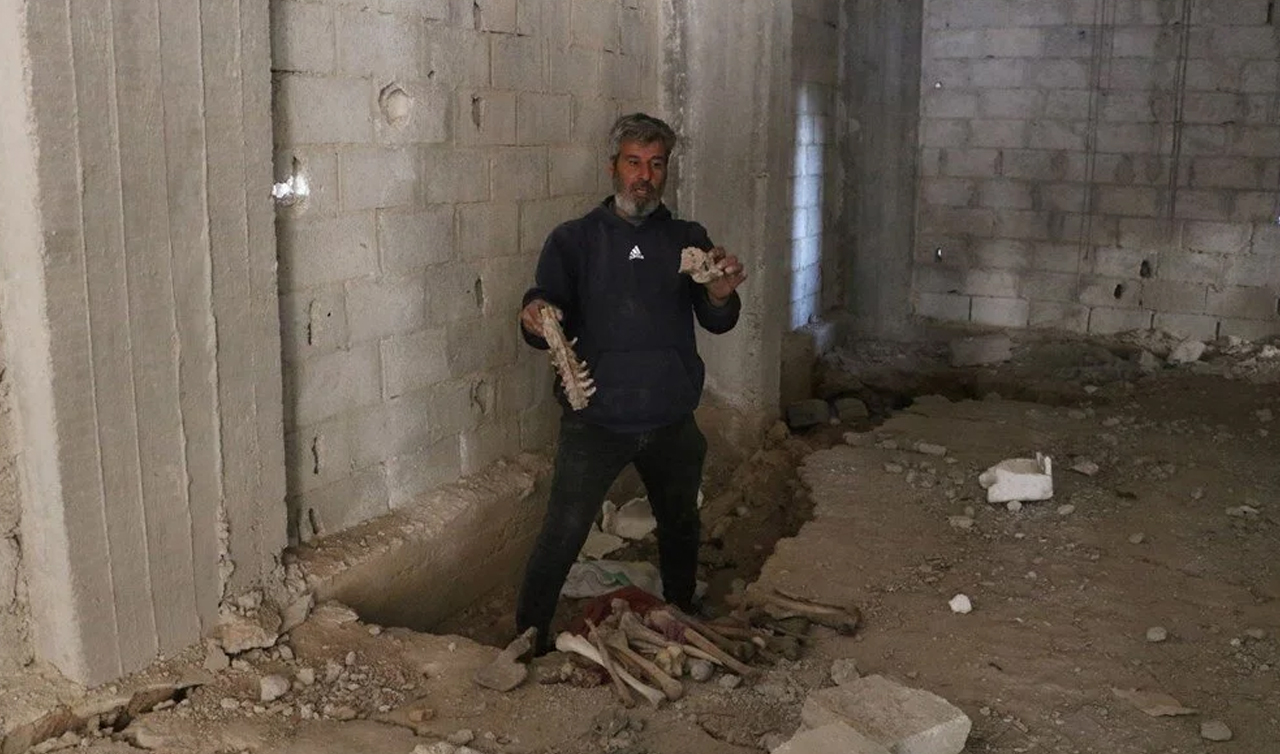 Rejim saldırıları sonucu enkaza dönen ve istihbarat görevlisi Emced Yusuf'un 2013 yılında 41 sivili gözlerini bağlayarak öldürmesiyle hatırlanan mahalledeki binaların altından rejim güçleri tarafından öldürülen sivillerin kemikleri çıkarılıyor.