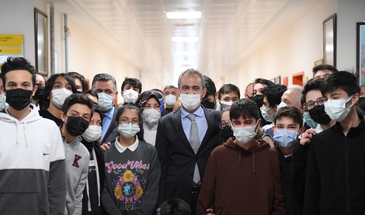 Bakan Özer, öğretmenler odası çıkışında çalan zil sonrası teneffüste öğrencilerle de bir araya geldi. Öğrencilerin sevgi gösterileriyle karşılaşan Özer, onlara derslerinde başarılar diledi.