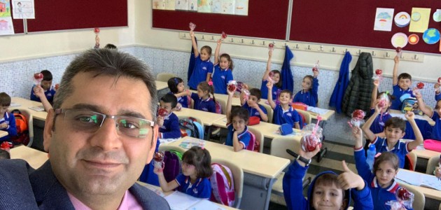 Bu kapsamda öğrencilere elma şekeri dağıtılarak "E" harfi öğretildi.