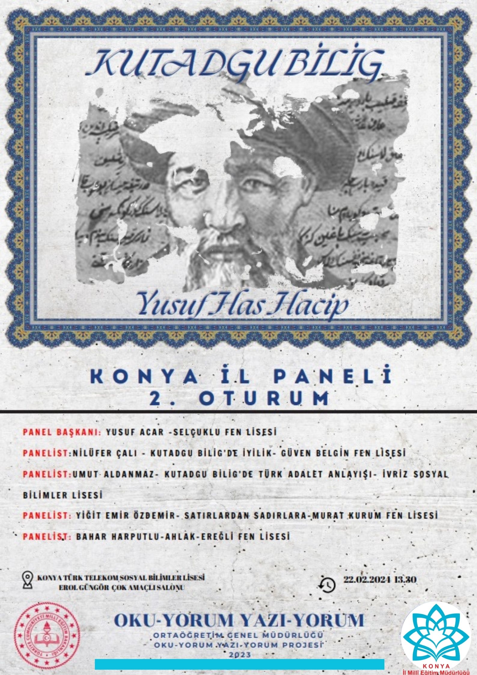 “Oku-Yorum Yazı-Yorum” projesi kapsamında, Konya İl Milli Eğitim Müdürlüğü koordinesinde Konya’da "Edebiyatımızın Bin Yıllık Sesi Kutadgu Bilig" konulu paneller gerçekleştirildi.