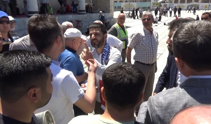 Sultan Selim Camii önünde sözde cemaat lideri Kuytul adına lokum dağıtmak isteyen ve Kuytul’un fotoğrafının olduğu atkı takan gruba camiden çıkan cemaat sert tepki gösterdi.