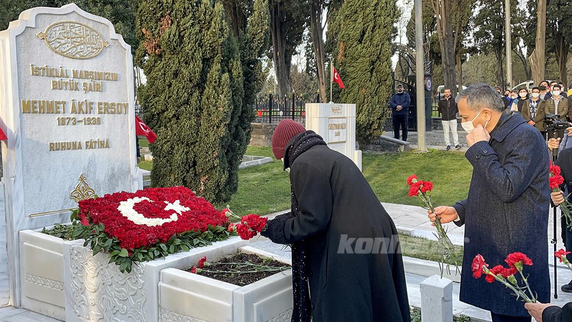 Ersoy'un Edirnekapı'daki kabri başında yapılan anma töreni, saygı duruşunun ardından İstiklal Marşı ve Aşr-ı Şerif okunmasıyla başladı. Törende, okunmuş olan hatmi şeriflerin duası İl Müftüsü Prof. Dr. Safi Arpaguş tarafından yapıldı.