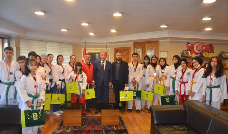 Konya da yapılan Bölge Taekwondo Şampiyonasında Takım birinciliği ile önemli bir başarıya imza atan genç sporcular mutluluklarını Ereğli Belediye Başkanı Hüseyin Oprukçu ile paylaştılar. Başkan Oprukçu’yu makamında ziyaret eden Çakırer Spor Salonu sporcuları desteklerinden dolayı da teşekkür ettiler.