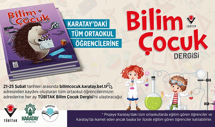 Karatay’da eğitim gören ortaokul öğrencilerinin TÜBİTAK Bilim Çocuk Dergisi’ni alabilmeleri için 25 Şubat Cuma gününe kadar https://bilimcocuk.karatay.bel.tr adresinden kaydını oluşturması gerekiyor. Projeye Karatay’daki tüm ortaokullarda eğitim gören öğrenciler ve Karatay’da ikamet eden ancak başka bir ilçede eğitim gören öğrenciler de katılabilecek.