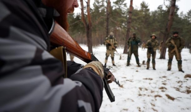 Ukrayna'nın başkenti Kiev'de, Ukrayna ordusu yedek birlikleri tarafından sivil halka savaş olasılığına karşı temel askeri eğitim veriliyor.