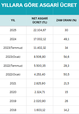 2018 yılında net 1.603 lira olan asgari ücret, 2025 yılı itibarıyla 22 bin 104 lira 67 kuruşa yükseldi. Bu süreçte en yüksek artış, yüzde 54,6 oranıyla 2023 Ocak döneminde gerçekleşti ve son yılların zam rekoru olarak kayıtlara geçti.