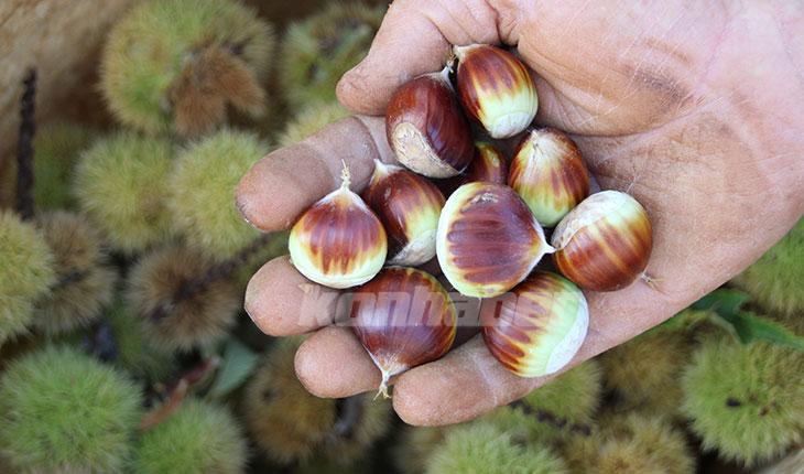 Çiftçi Nihat Teke'nin 8 yıl önce arkadaşının tavsiyesi üzerine 1330 rakımlı Sarıkaya Mahallesi'nde diktiği ve ilk kez geçen sene 6 ton ürün topladığı kestanede bu yıl verim arttı.