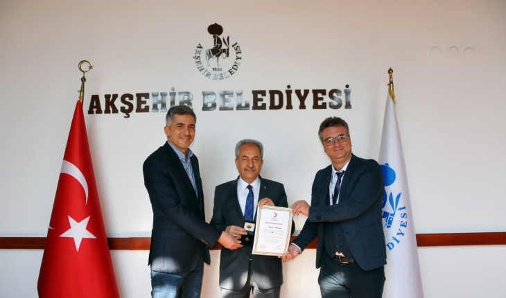 Konya’nın Akşehir ilçesi Kızılay Şube Başkanı Yalın Sümer, bugüne kadar 13 kez kan bağışında bulunan Akşehir Belediye Başkanı Salih Akkaya’ya bronz madalya verdi.