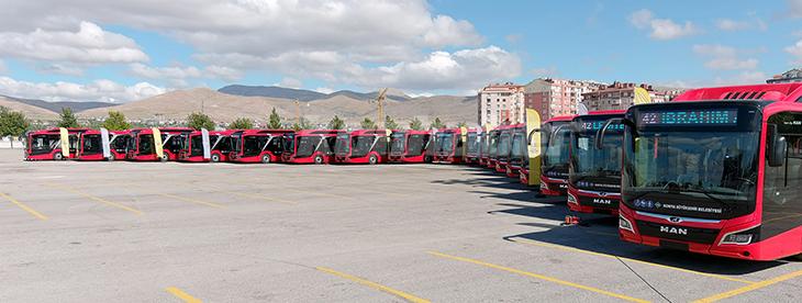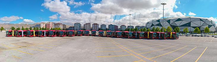 YERLİ ÜRETİM 73 OTOBÜSÜN MALİYETİ 281 MİLYON TLBir taraftan da otobüslerin konforunu artırmak için uzun süredir yaptıkları çalışmaların meyvesini aldıklarını anlatan Başkan Altay, “Şu anda ilk etabını gördüğünüz, Türkiye’de üretilen, yerli üretim olan, Türkiye’nin en güzel otobüslerini şehrimize kazandırdık. Bugün, 11 solo, 7 körüklü ve 1 çift katlı otobüsümüzü sizlerle paylaşıyoruz. İnşallah bunların plaka işlemleri ve şoför eğitimleri bittikten sonra bu hafta itibariyle yollarda yolcularımıza hizmet etmeye başlayacak. Toplamda 73 otobüs için 281 milyon lira ödeme gerçekleştirdik. Ve bu 281 milyon liranın tamamı öz kaynaklarla gerçekleştirildi. Herhangi bir finansman kullanılmadı. İlk etapta üretimi tamamlanan bugün 19 otobüsümüzü hizmete alıyoruz ama yılsonuna kadar peyderpey bu 73 otobüsümüz Konyalıların hizmetinde olacak. Bu yeterli mi? Değil. İnşallah en kısa sürede yeni otobüs sayımızı 100’e, sonra da daha fazlaya çıkarmak için görüşmelere devam ediyoruz.” ifadelerini kullandı.