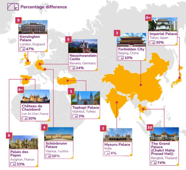 Hindistan'daki ünlü Mysor Sarayı ikinci, Çin'in başkenti Pekin'de bulunan dünyaca ünlü "Yasak Şehir” ise üçüncü sırada yer aldı.