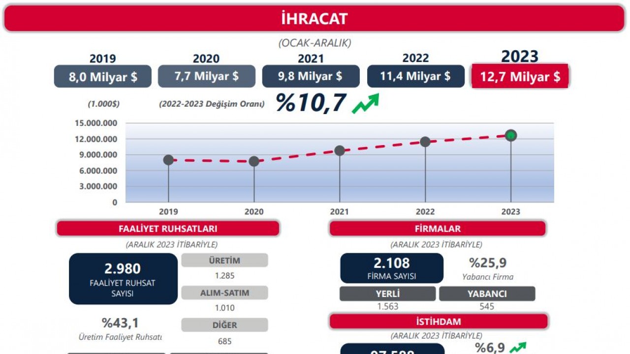 Bakanlıktan yapılan açıklamada, "2023 yılında, serbest bölgelerden gerçekleştirilen ihracat yüzde 10,7 artarak 12,7 milyar dolara yükselmiştir. Avrupa Birliği'ne yapılan ihracat yüzde 11 düzeyinde artış ile 6 milyar dolara; Kuzey Amerika'ya yapılan ihracat ise yüzde 27 yükseliş ile 1,7 milyar dolara ulaşmıştır" denildi.