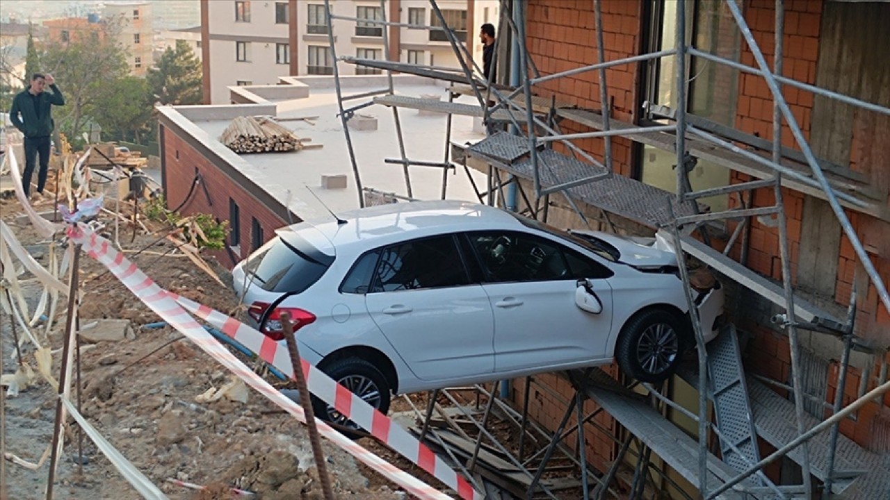 Kontrolden çıkan otomobil istinat duvarıyla inşaat arasında asılı kaldı