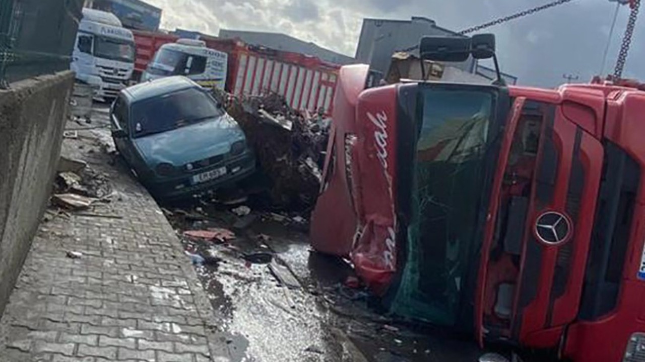 Virajı alamayan tır, park halindeki araçların üzerine devrildi