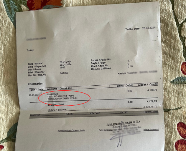 O an başka otel bulamayacağı için ücreti ödemek zorunda kalan vatandaşın paylaştığı fatura ise kısa sürede gündem oldu. Otel yönetiminin yaptığı skandal hareketi "Milliyet farkı karşılığı tahsil edildi" ifadesiyle faturaya işlediği görüldü.