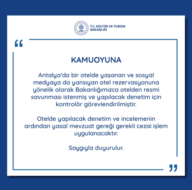 Yaşanan olay Kültür ve Turizm Bakanlığı'nı da harekete geçirdi. Bakanlıktan yapılan açıklamada "Antalya'da bir otelde yaşanan ve sosyal medyaya da yansıyan otel rezervasyonuna yönelik olarak Bakanlığımızca otelden resmi savunması istenmiş ve yapılacak denetim için kontrolör görevlendirilmiştir.