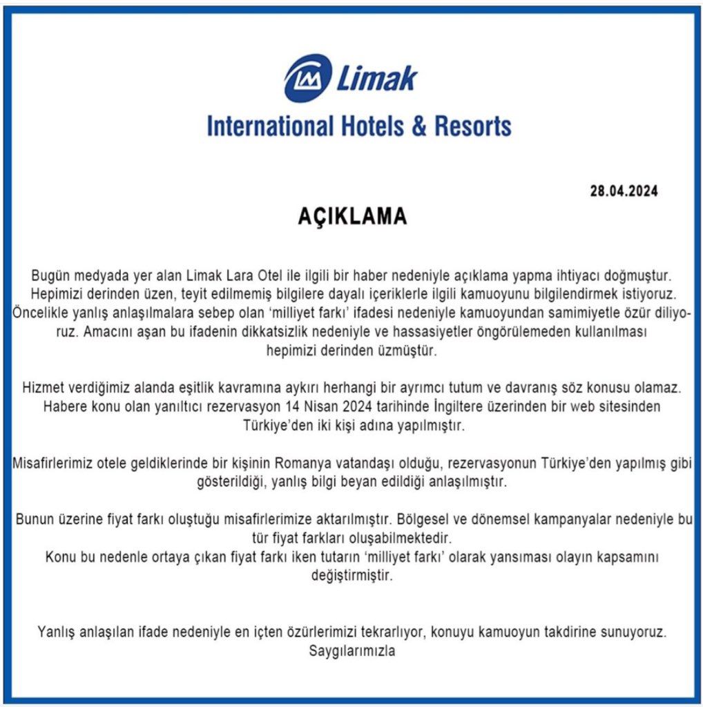 Bakanlık tarafından inceleme başlatılan Limak Lara Otel'den de açıklama gecikmedi. İçeriklerin birçoğunun teyit edilmemiş bilgilere yer verdiğini belirten şirket, "Öncelikle yanlış anlaşılmalara sebep olan 'milliyet farkı' ifadesi nedeniyle kamuoyundan samimiyetle özür diliyoruz. Amacını aşan bu ifadenin dikkatsizlik nedeniyle ve hassasiyetler öngörülemeden kullanılması hepimizi derinden üzmüştür.