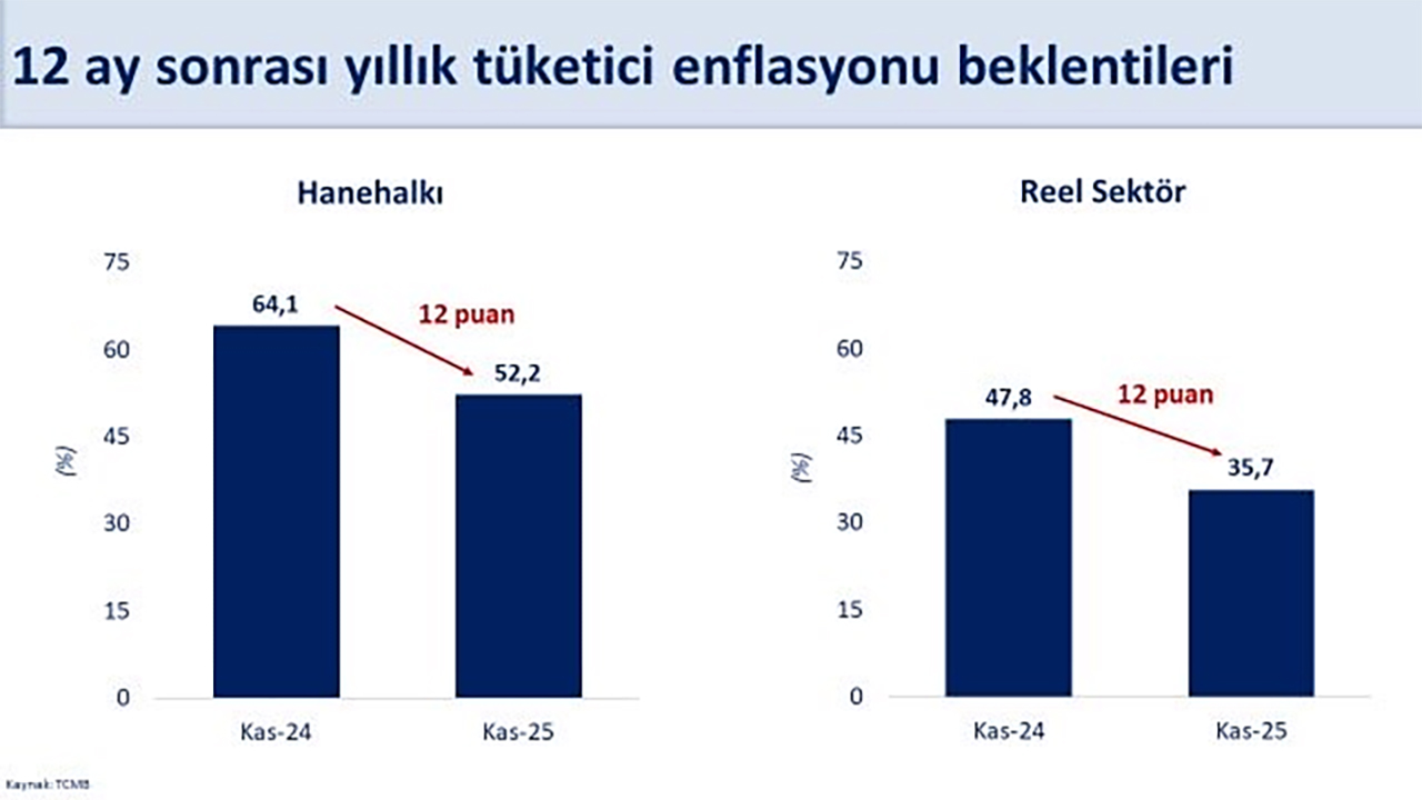12 ay sonra enflasyon beklentilerinin kasımda gerilediğini belirterek şu ifadeleri kullandı: "Hanehalkı ve reel sektörün 12 ay sonrası enflasyon beklentileri kasımda geriledi. Geçen yılın aynı dönemine göre beklentiler 12 puan iyileşti. Dezenflasyon odaklı politikalarımızı kararlılıkla uygulamayı sürdürürken enflasyondaki düşüşün devamıyla birlikte beklentilerdeki iyileşmenin güçleneceğini ve fiyatlama davranışlarındaki katılığın azalacağını öngörüyoruz. Ekonomimizi fiyat istikrarının sağlandığı, verimliliğin arttığı ve refah düzeyinin yükseldiği güçlü bir yapıya kavuşturmak için gerekli adımları kararlılıkla atmaya devam edeceğiz."
