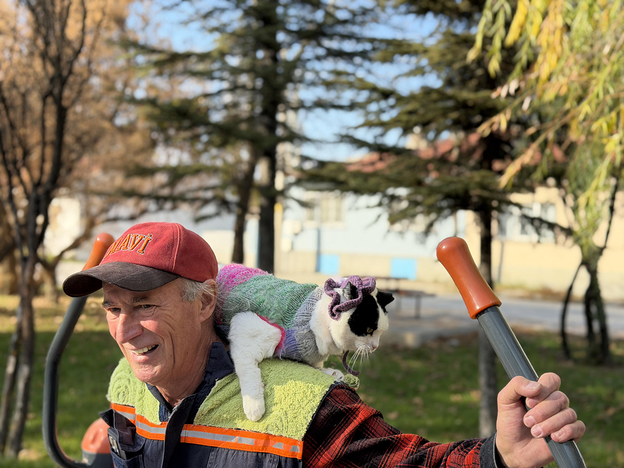 Kedisi Sylvia’yı bir an bile yanından ayırmayan Mustafa Rahmi Erçetin, “12 yıl önce Bursa’nın Bademli köyünde bahçede oturuyordum, karşımda sağlık ocağı vardı. Balkonda otururken ufacık kedi gördüm. Avucum kadar bir şeydi. Sağlık ocağının kapısına geldi, geri döndü. İçim sızladı. Yakaladım ve eve getirdim. Şu an 12 yılın içindeyiz, 12 yıldır benimle. İnsanların çok dikkat ettiği, şaşırdığı imrendiği olay şu. ‘Ağabey, Sylvia’yı nasıl alıştırdın? Nasıl omzunda geziyor? Nasıl eğittin’ soruları oluyor. Bisikletle giderken omzumda görüyorlar, çok ilgi çekici buluyorlar. Büyük bir tebessümle karşılıyorlar. Sorular soruyorlar, ben de anlatıyorum. Sabah kalkarım, Sylvia tuvaletini yapar, mamalarını veririm, hazırlanırız ve giysilerimizi giyeriz. Kışsa şapkalarımızı takarız, yazsa ona göre yazlık elbiselerimizi giyeriz. Kreasyonumuz geniştir. Bazen yürüyerek, bazen ise bisikletimle giderim. Kafelere, restoranlara gider, yemeğimizi de yeriz” dedi.