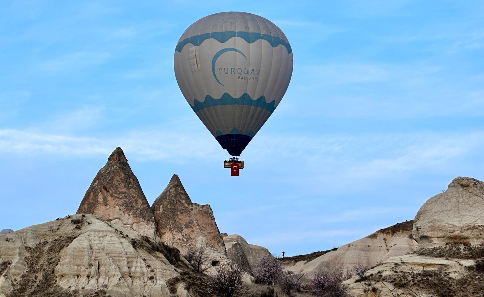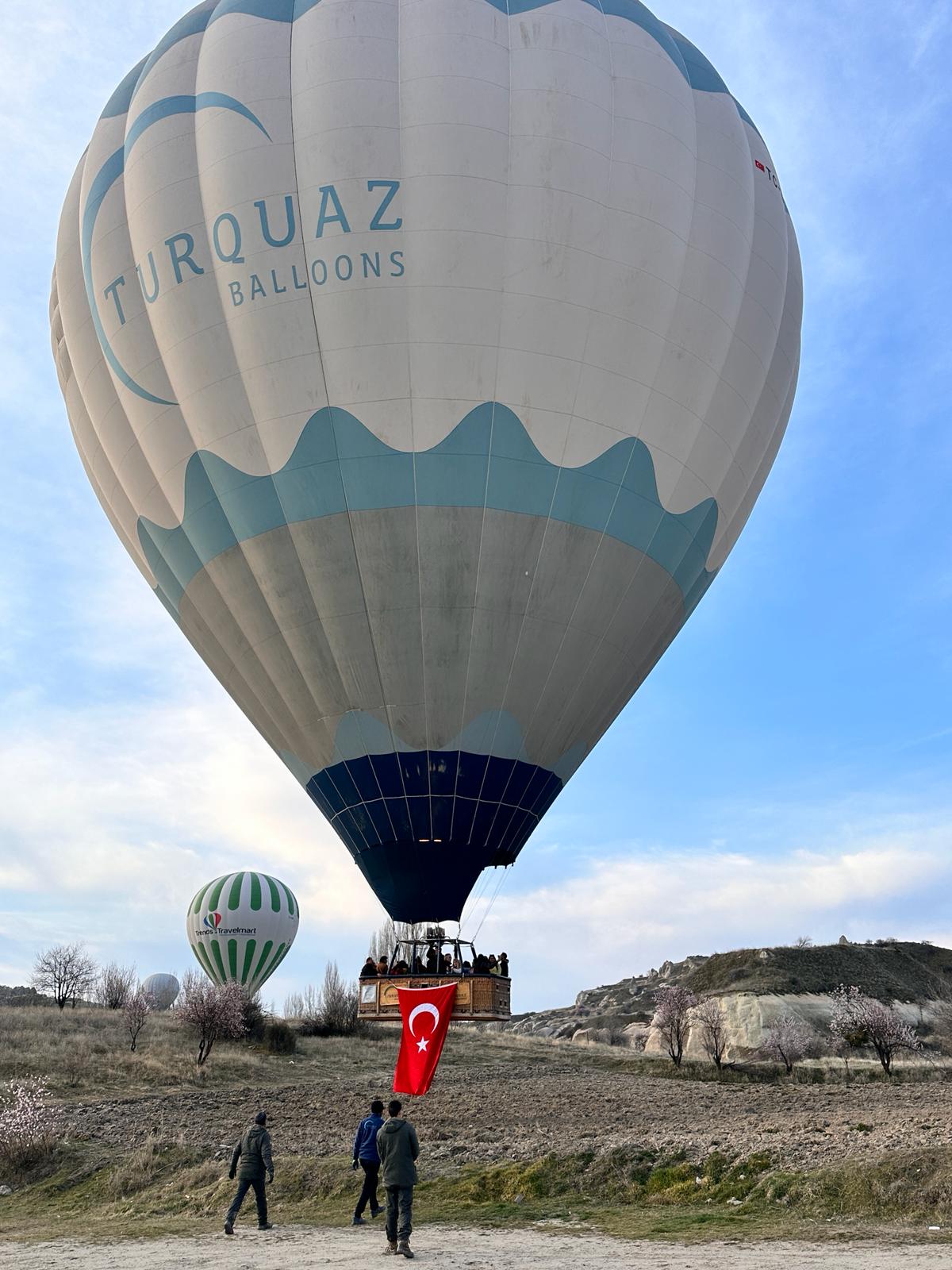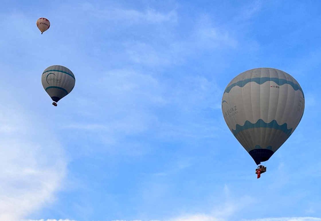 Turistlerin bindiği sıcak hava balonlarının bazılarının sepetlerine firma görevlilerince Türk bayrağı asıldı