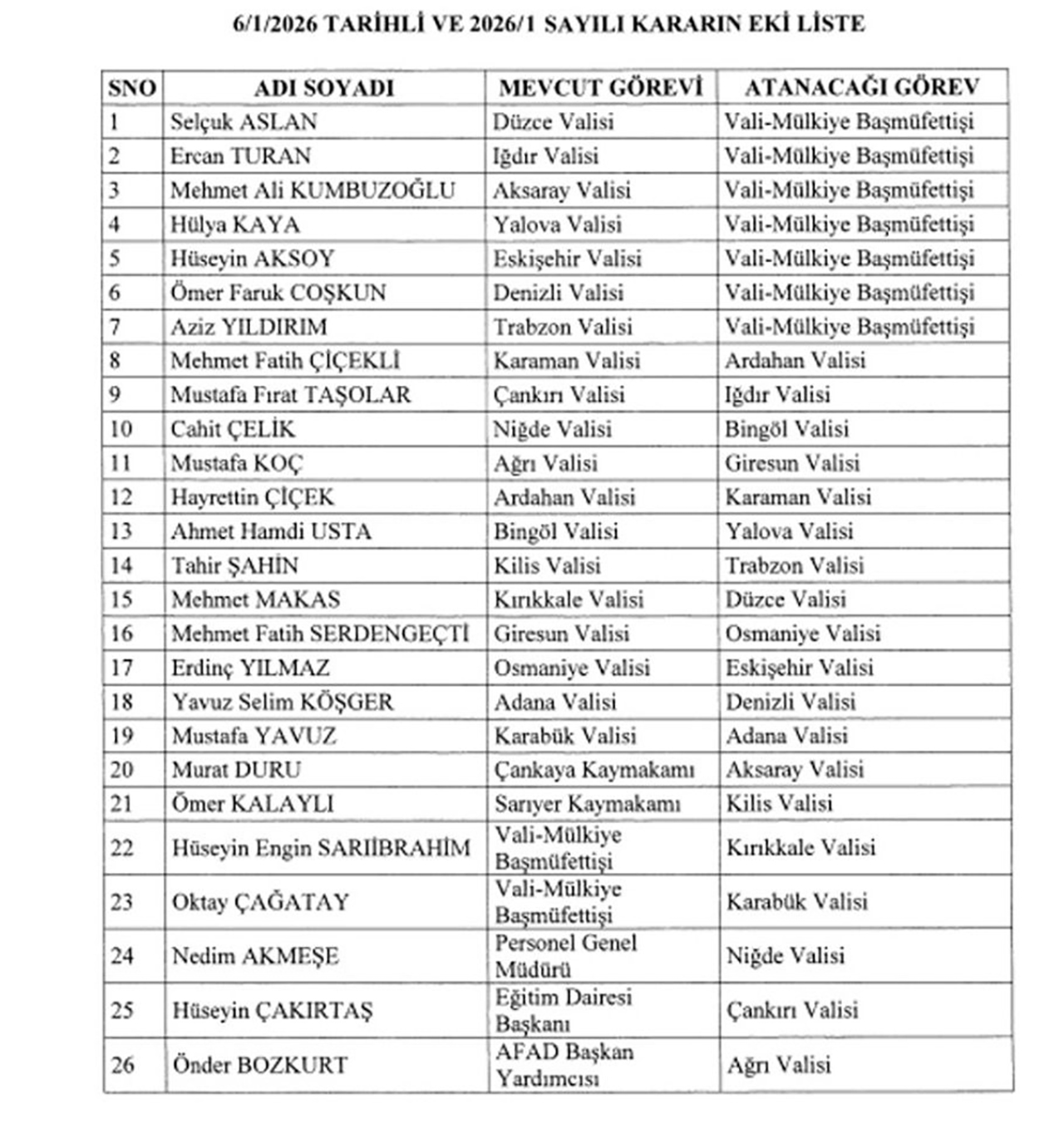 Cumhurbaşkanı Recep Tayyip Erdoğan imzasıyla yayımlanan kararname ile Düzce Valisi Selçuk Aslan, Iğdır Valisi Ercan Turan, Aksaray Valisi Mehmet Ali Kumbuzoğlu, Yalova Valisi Hülya Kaya, Eskişehir Valisi Hüseyin Aksoy, Denizli Valisi Ömer Faruk Coşkun ve Trabzon Valisi Aziz Yıldırım, "vali-mülkiye başmüfettişliği" görevine getirildi.