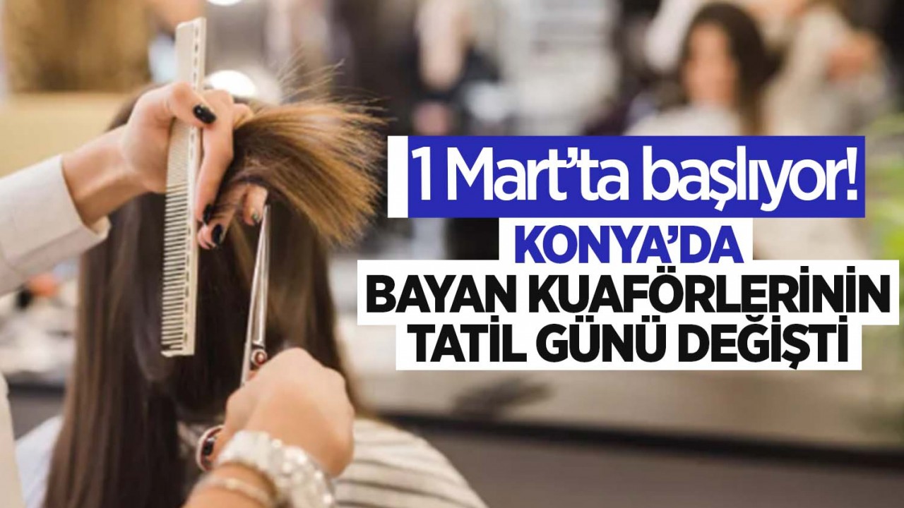 Konya Berberler ve Kuaförler Odası Başkanı Veli Baranok, "Bayan kuaförler arasında yaptığımız anket sonucu haftalık tatil gününün pazar günü yapılması sonucu çıktı. Konya Valiliği, Konya Ticaret Odası, Karatay, Selçuklu ve Meram Belediyelerinin onayı ile her hafta salı günü tatil yapan bayan kuaförleri pazar günleri tatil yapmaya başlayacak. Uygulama 1 mart 2024 tarihi itibariyle devreye girecek ve 3 mart pazar günü bayan kuaförleri kapalı olacak." dedi.