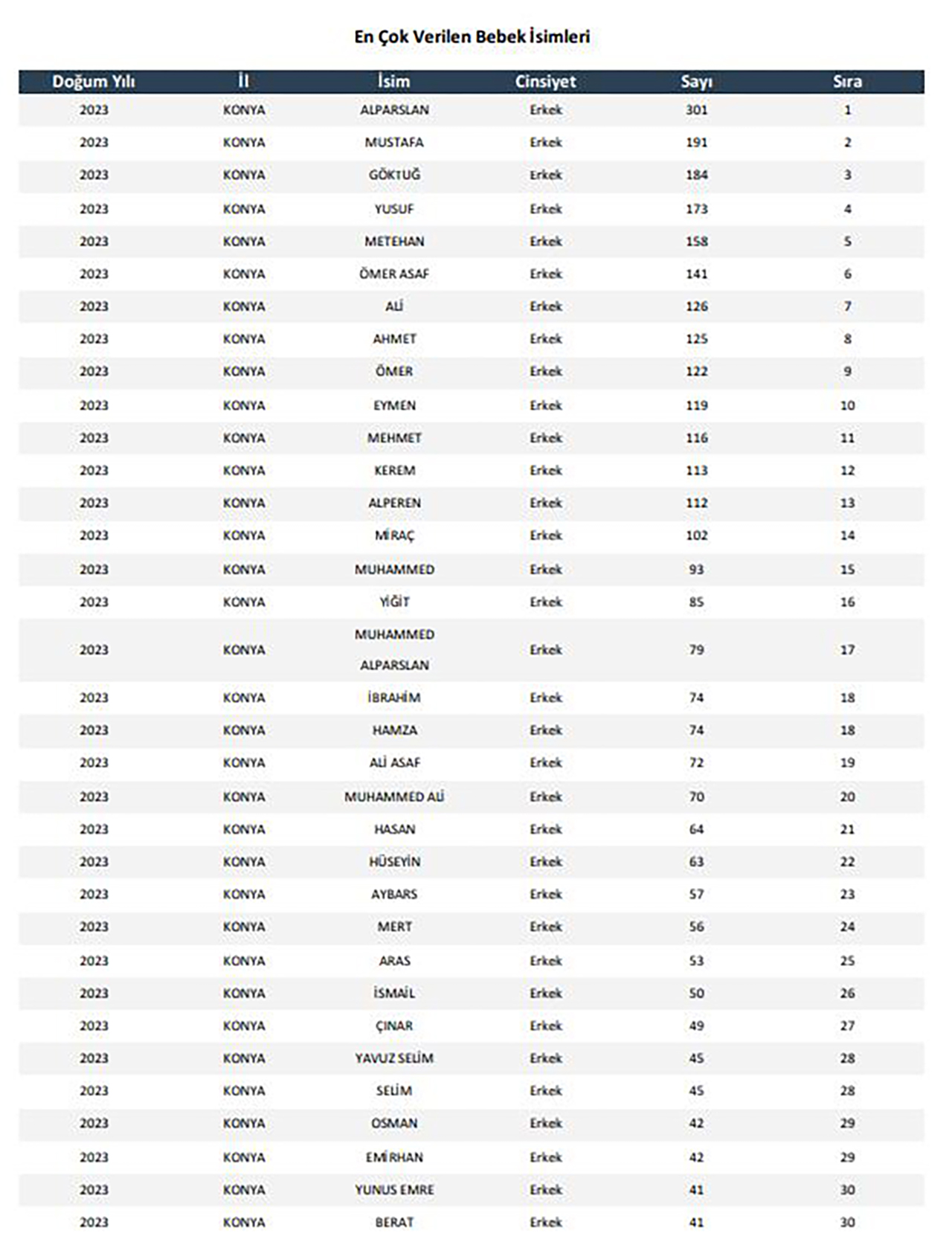 Konya’da en çok tercih edilen isimlere bakıldığında erkek bebeklerden 301’ine Alparslan, 191’ine Mustafa ve 184’üne ise Götuğ ismi konuldu. Bu isimleri sırasıyla Yusuf, Metehan, Ömer Asaf, Ali, Ahmet, Ömer, Eymen, Mehmet, Kerem, Alperen, Miraç, Muhammed, Yiğit, Muhammed Alparslan, İbrahim. Hamza, Ali Asaf, Muhammed Ali, Hasan, Hüseyin, Aybars, Mert, Aras, İsmail, Çınar, Yavuz Selim, Selim, Osman, Emirhan, Yunus Emre ve Berat takip etti.