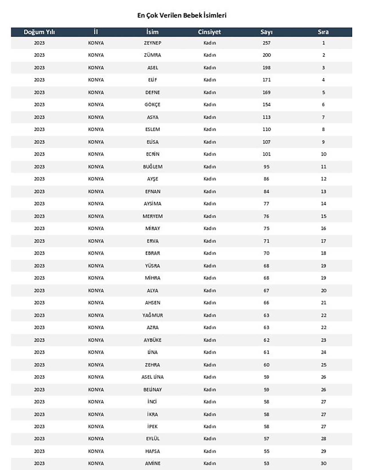 Konya’da en çok tercih edilen isimlere bakıldığında kız bebeklerden 257’sine Zeynep, 200’üne Zümra, 198’ine ise Asel ismi verildi. Bu isimleri sırasıyla Elif, Defne, Gökçe, Asya, Eslem, Elisa, Ecrin, Buğlem, Ayşe, Efnan, Aysima, Meryem, Miray, Erva, Ebrar, Yüsra, Mihra, Alya, Ahsen, Yağmur, Azra, Aybüke, Lina, Zehra, Asel Lina, Belinay, İnci, İkra, İpek, Eylül, Hafsa ve Amine takip etti.