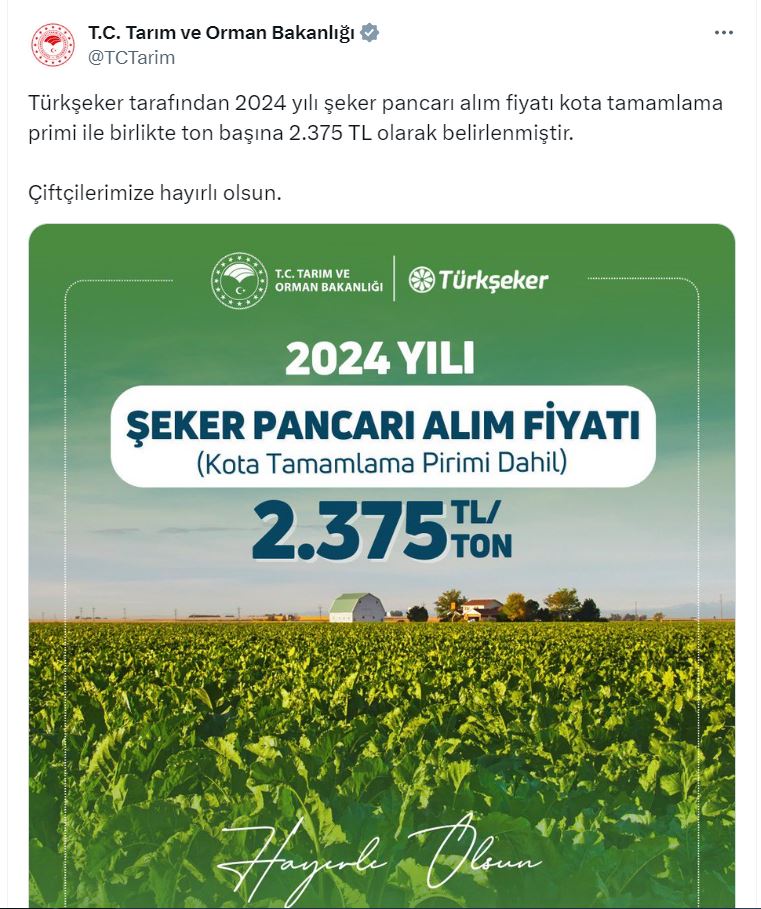 Bakanlığın sosyal medya hesabından yapılan açıklamada, "Türkşeker tarafından 2024 yılı şeker pancarı alım fiyatı kota tamamlama primi ile birlikte ton başına 2.375 TL olarak belirlenmiştir. Çiftçilerimize hayırlı olsun" denildi.