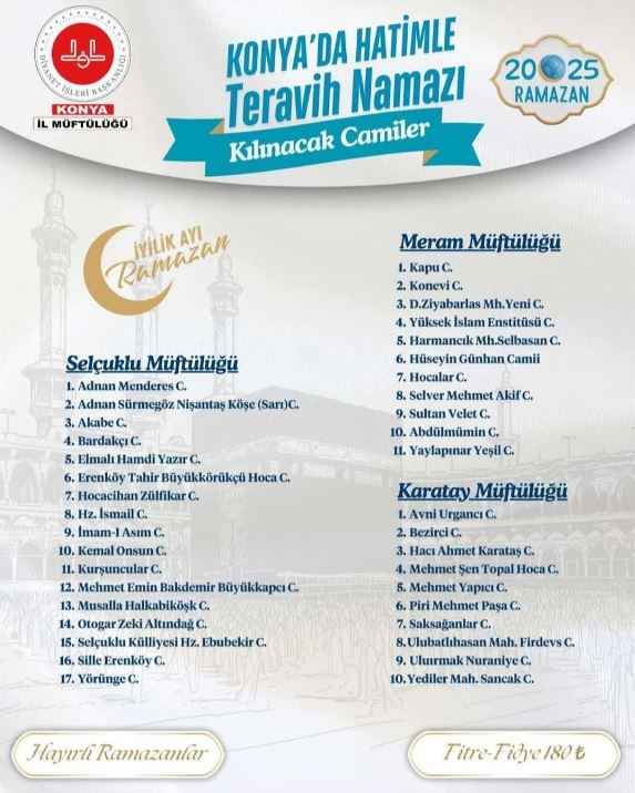 Konya İl Müftülüğü 2025 yılı Ramazan ayında hatimle teravih namazı kılınacak camileri duyurdu.