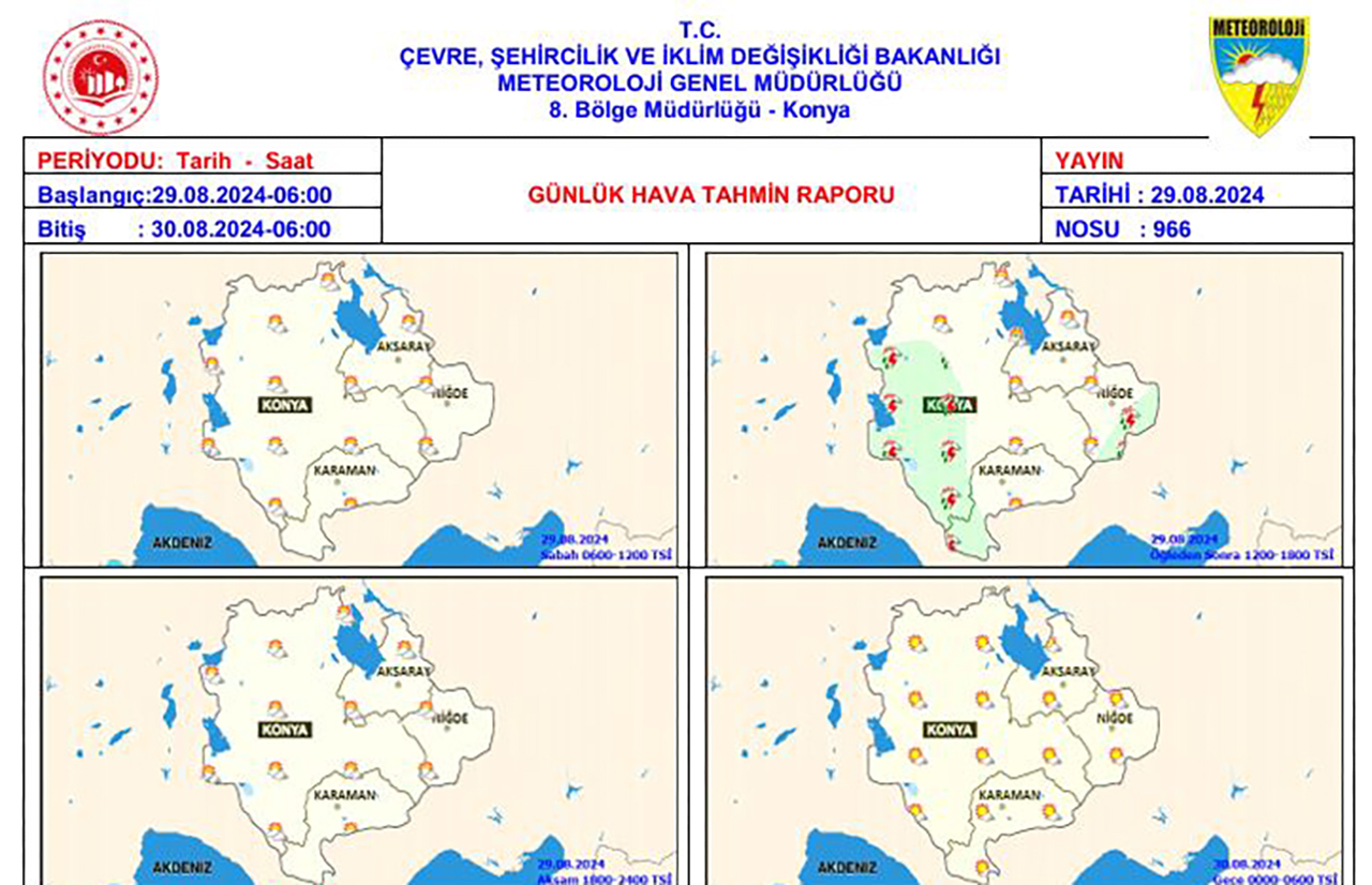 Meteoroloji 29 Ağustos hava durumu raporunu yayımladı. Buna göre Konya'da yerel olmak üzere sağanak ve gök gürültülü sağanak yağış bekleniyor. İşte Konya ve 31 ilçesinde hava tahmini.