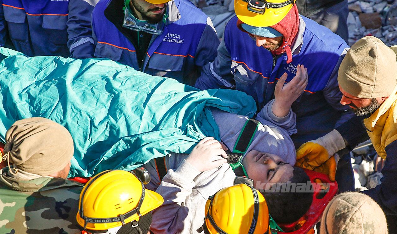 Enkazda 5 yaşındaki Furkan Özbay'a ulaşan ekipler, çıkardıkları yaralı çocuğu sağlık görevlilerine teslim etti.