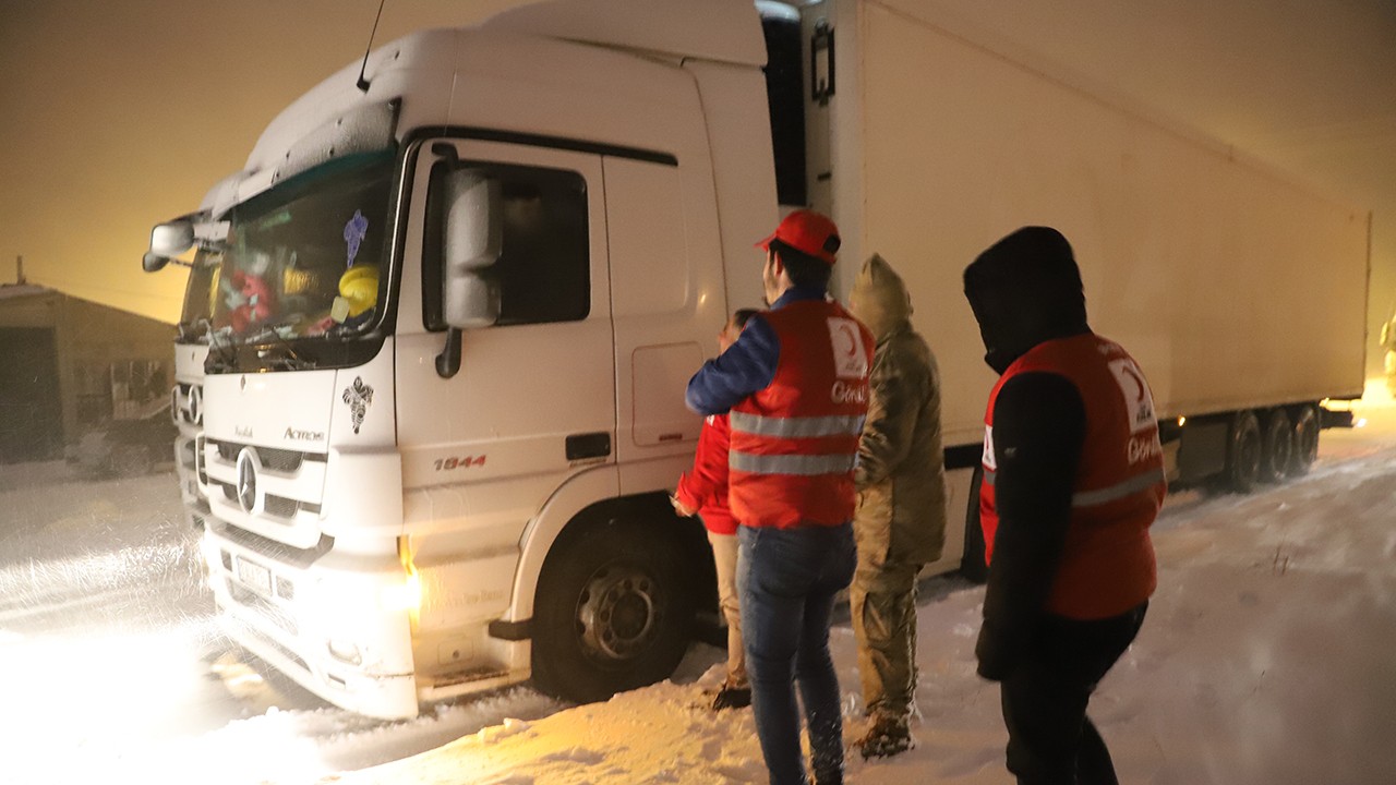 Olumsuz hava koşullarının etkili olduğu Çaldıran-Doğubayazıt yolu Tendürek mevkisinde gece araçlarıyla yolda kalan sürücülere Türk Kızılay Muradiye Şubesi gönüllülerince kumanya verildi.