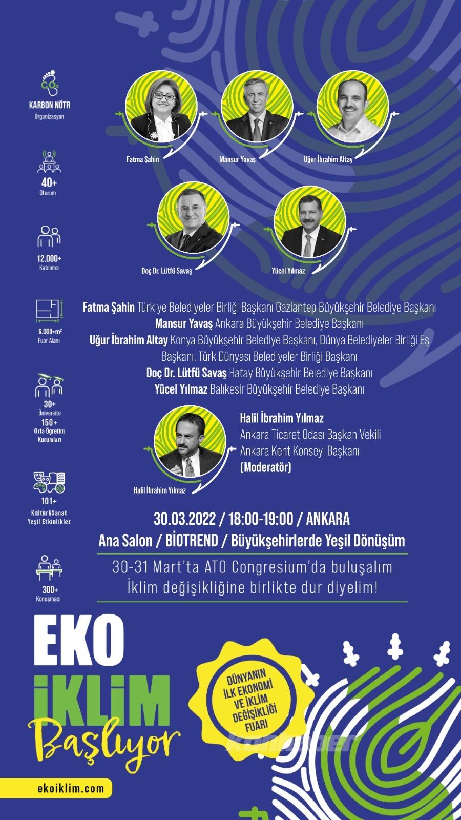 İklim değişikliğiyle mücadele ve yeşil dönüşüm konularında farkındalık oluşturmak amacıyla Ankara Ticaret Odası öncülüğünde ve çok sayıda kurum ve kuruluşun paydaşlığında 30-31 Mart tarihlerinde gerçekleştirilecek “EKO İKLİM Ekonomi ve İklim Değişikliği Zirvesi”, iklim değişikliğiyle mücadele konusunda atılacak ilk adımın yerel yönetimlerden başlaması gerektiği bilinciyle Ankara, Gaziantep, Konya, Hatay, Balıkesir Büyükşehir Belediye Başkanlarını “Büyükşehirlerde Yeşil Dönüşüm” başlıklı oturumda bir araya getirecek.