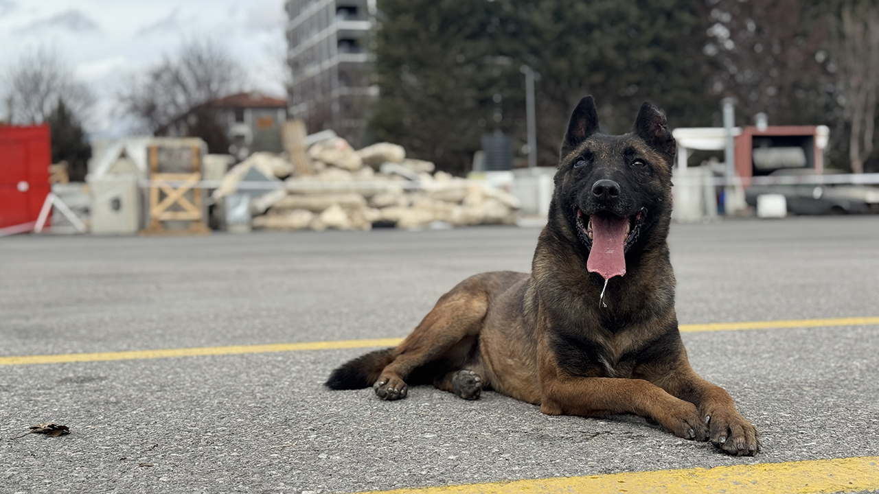 İtfaiye parkurunda görev sürekliliğini sağlamak için yetiştirilen köpeklerden Vondi, hassas burnu ve yetenekleriyle olası afetlerde görev yapmak için hazır bekliyor.