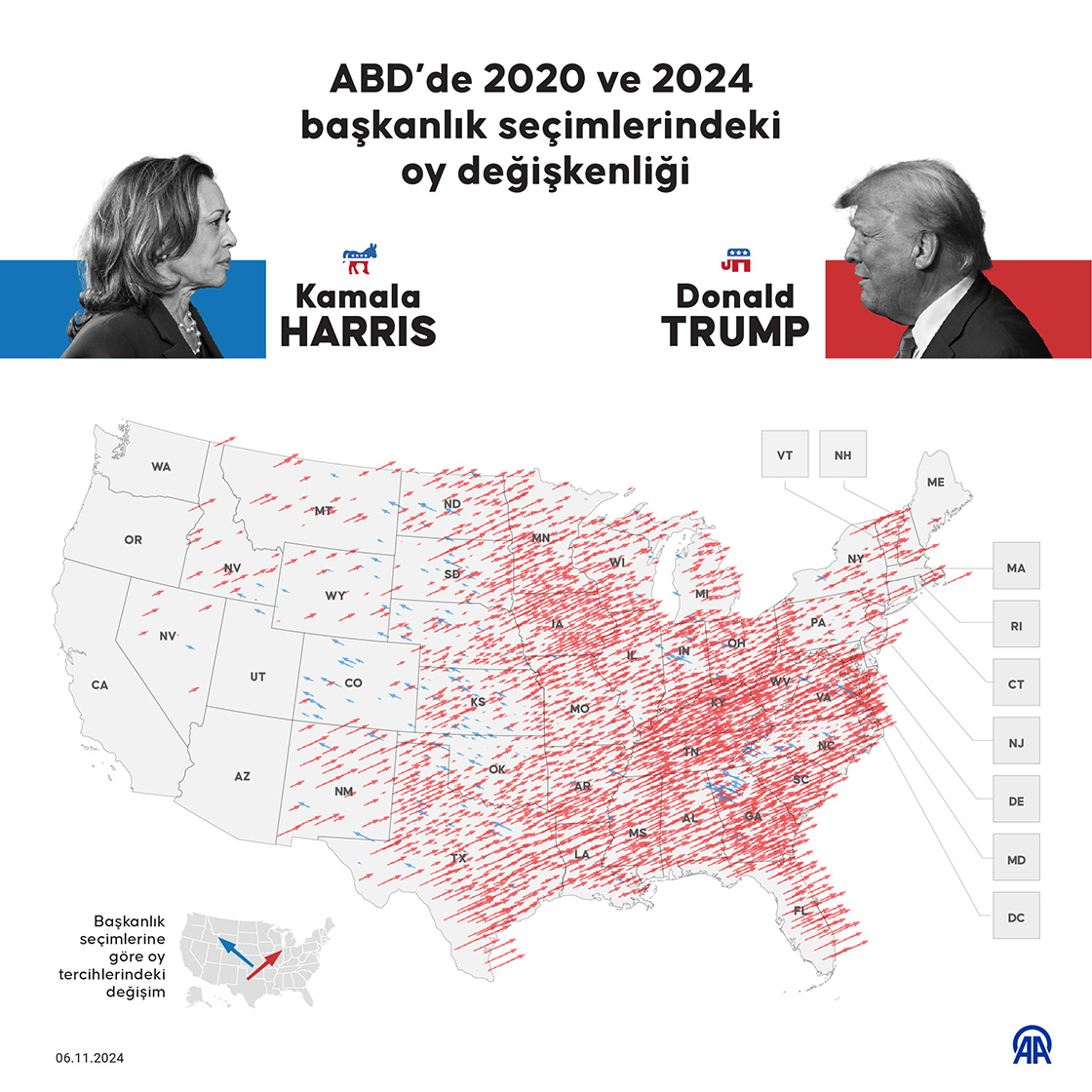 ABD'de sandığa giden milyonlarca seçmen, Demokrat Kamala Harris ile Cumhuriyetçi Donald Trump arasında tercihini yaptı. Kesin olmayan sonuçlara göre Trump 267, Harris 224 delege kazandı.