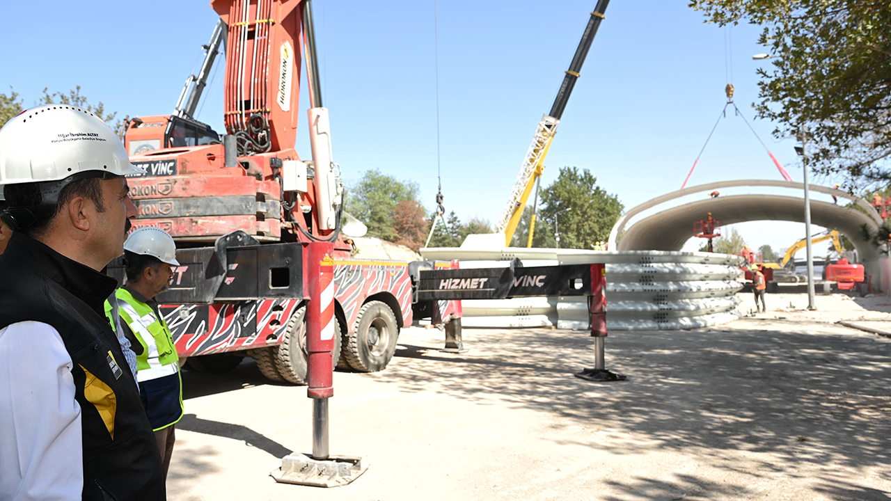 Konya Büyükşehir Belediye Başkanı Uğur İbrahim Altay, Büyükşehir Belediyesi tarafından Ankara Caddesi ile Adana Çevreyolu kesişiminde bulunan Marangozlar Köprülü Kavşağı’nda sürdürülen çalışmaları inceledi. Marangozlar Köprülü Kavşağı’nda günün her saatinde çok ciddi bir yoğunluk oluştuğunu, bunu gidermek adına önemli bir çalışma başlattıklarını belirten Başkan Altay, “Burada inşaatı hızlı yapmak adına Türkiye’de bu açıklıkla ve bu büyüklükle yapılmış ilk yöntemi deniyoruz. Çelik parçalar fabrikada bükülmüş olarak geliyor, burada birleştiriyoruz ve basınç kuvvetiyle çalışacak bir sistem oluşturuyoruz. Gidiş-dönüş aksında hem araçlarımız için bir tünel oluşturuyoruz hem de bisiklet ve yaya yolları için tüneller oluşturuyoruz. Çelik bir tünelin içinden geçilecek bir sistem oluşuyor.” dedi.